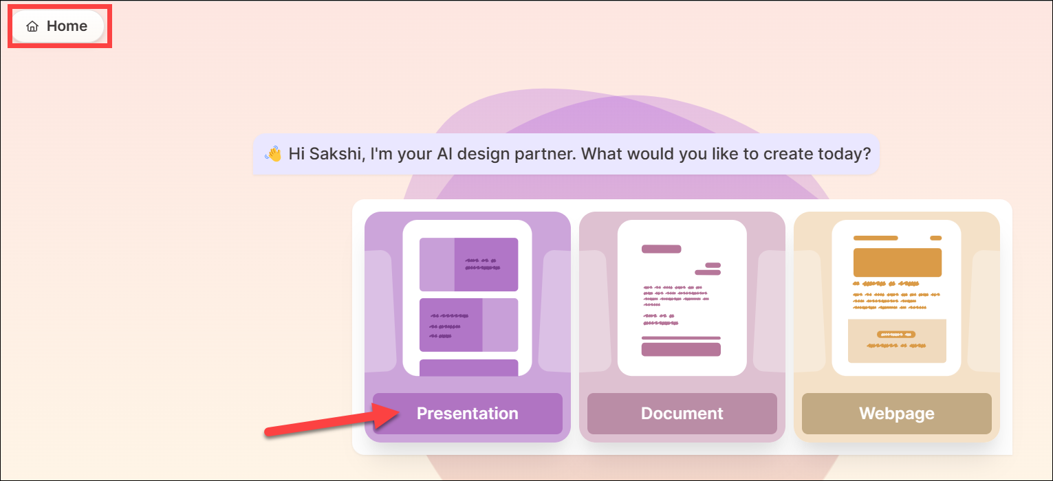 Gamma AI is set up and ready to use. Select whether you want to create a 'Presentation', 'Document', or 'Webpage'. If you don't want to create anything now, click the 'Home' button in the top left corner. Remember that this will start a generate session with the AI and will use up your credits. For this guide, we selected 'Presentation', and hence, we'll be creating a deck.