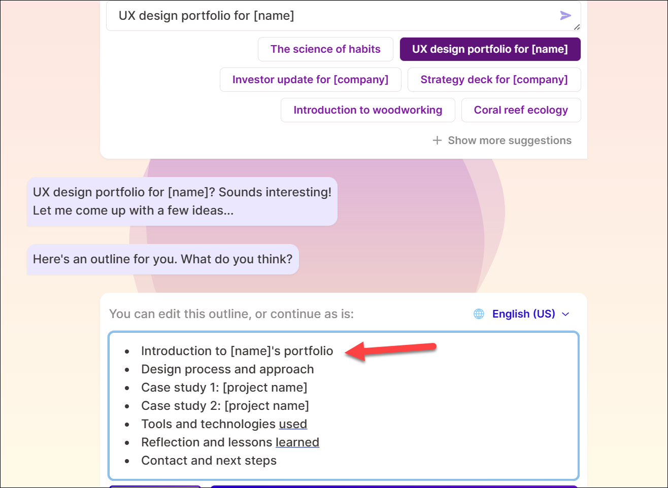 Gamma AI will generate an outline that you can preview. You can also edit it yourself or ask Gamma to regenerate it.