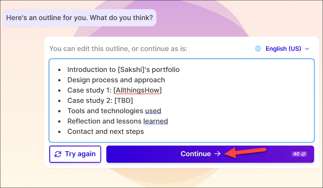 Once you're happy with the outline, click on the 'Continue' button. This act will use 40 credits.