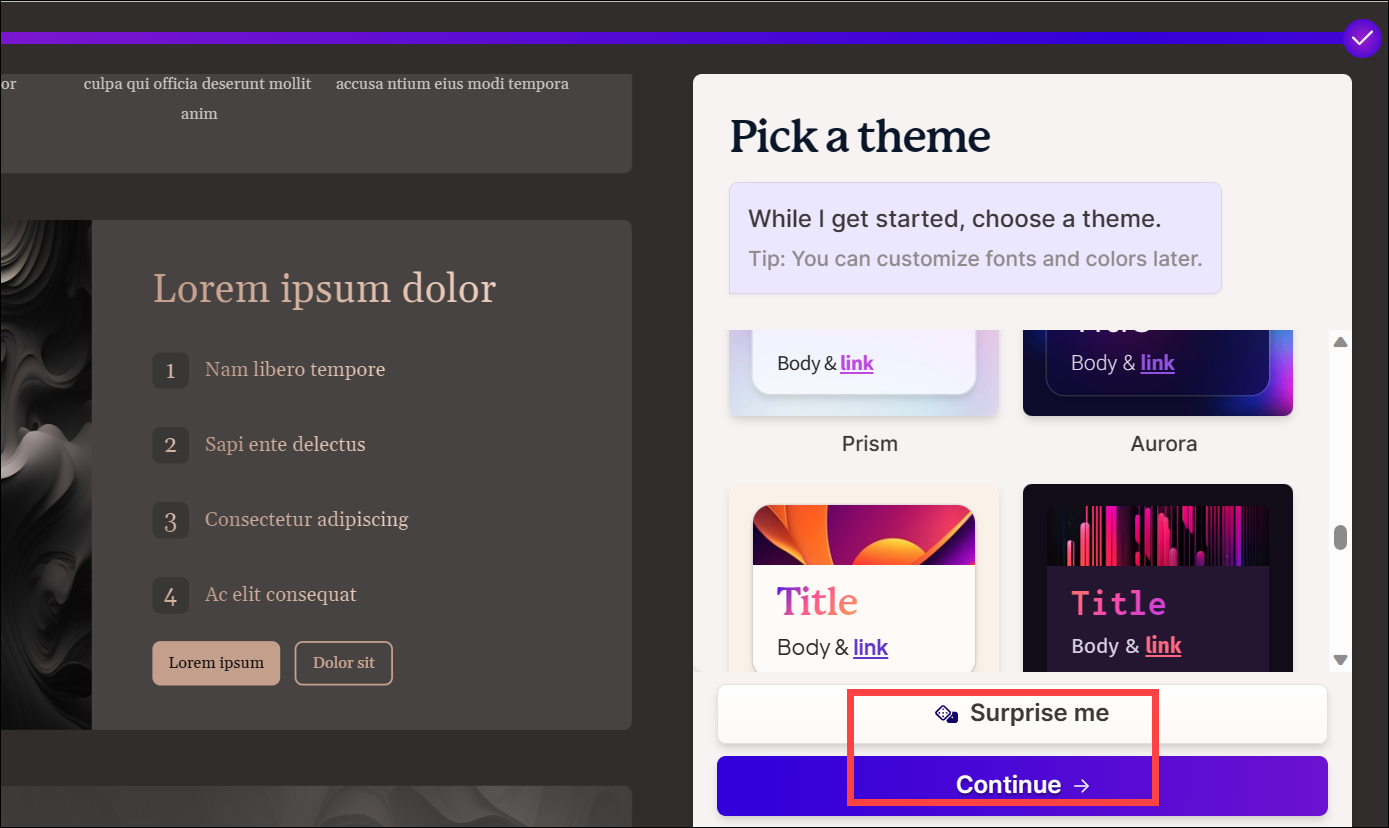 Next, choose a theme for your deck. You can navigate between different themes from the panel on the right or roll the dice, i.e., click the 'Surprise Me' button to let the AI choose a theme for you. Click 'Continue' once you're happy with the theme.
