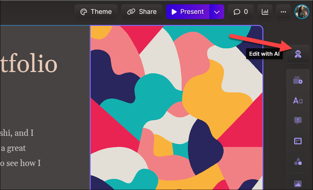 To ask Gamma AI to edit the presentation, click the 'Edit with AI' button from the toolbar on the right.