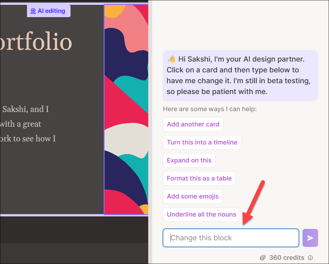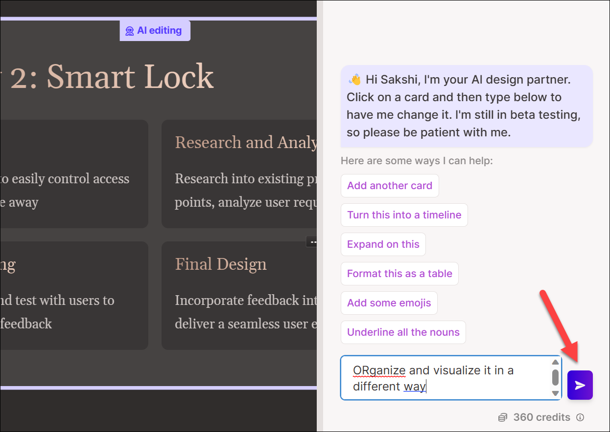Depending on the request, it might show some suggestions for edited content, and you can choose which option you like. Or it might simply make the changes, and you can decide whether you want to keep the edited or the original card.