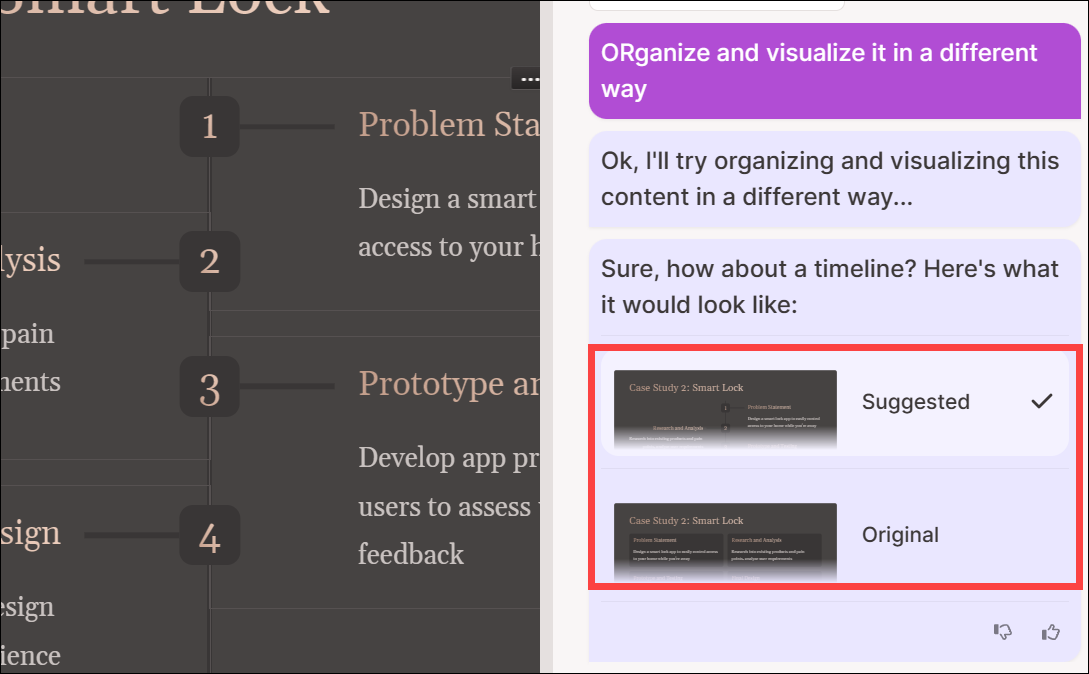 The panel for using the AI will open on the right. You can ask it anything – to change the entire theme, add a new card (slide in a presentation), edit the current card, expand on a topic, format the information as a table, or change the visualization.