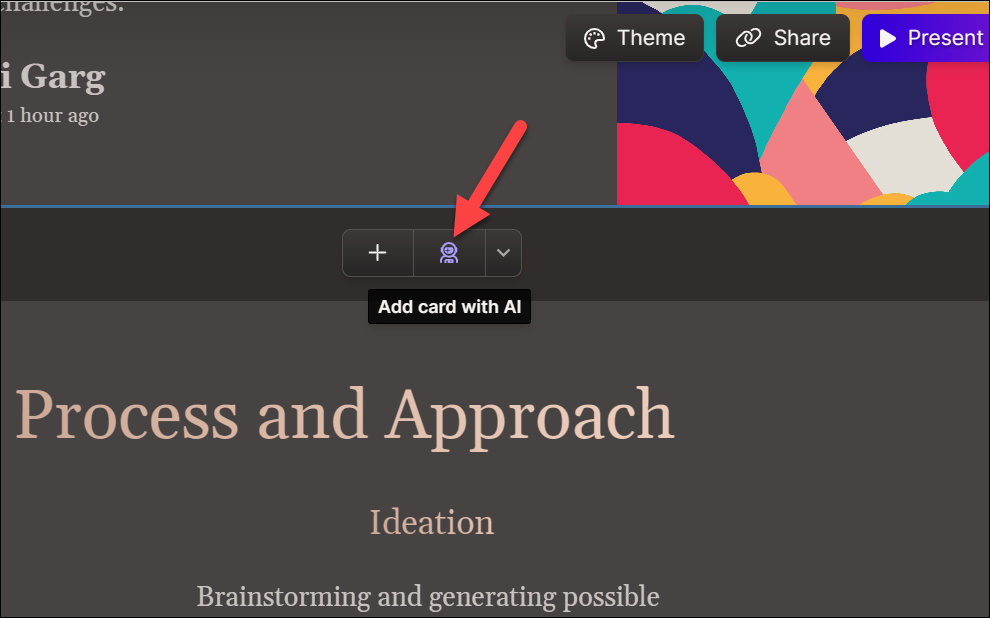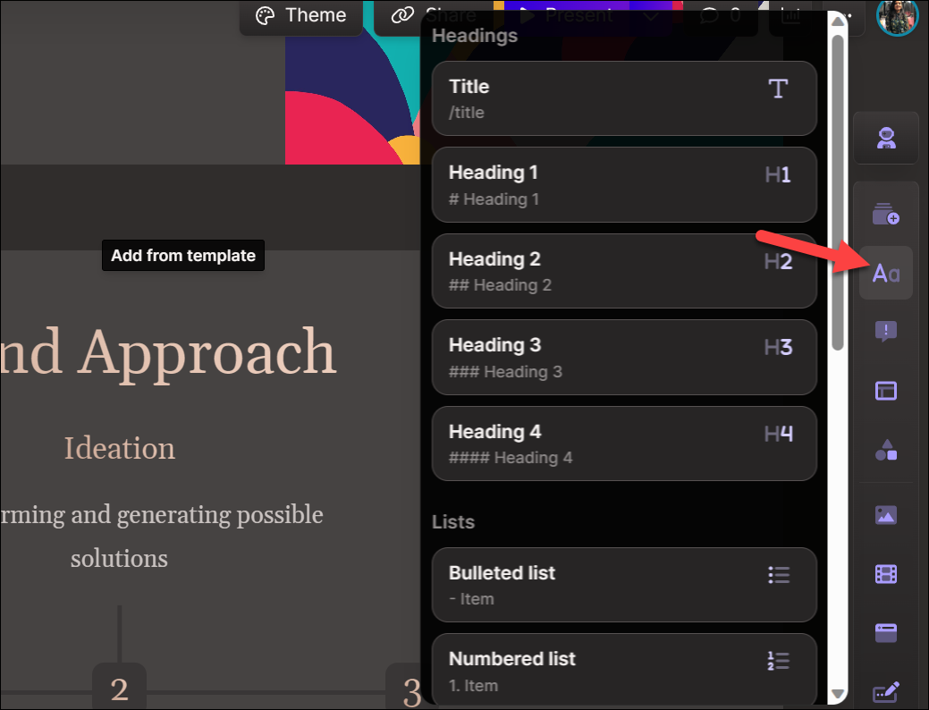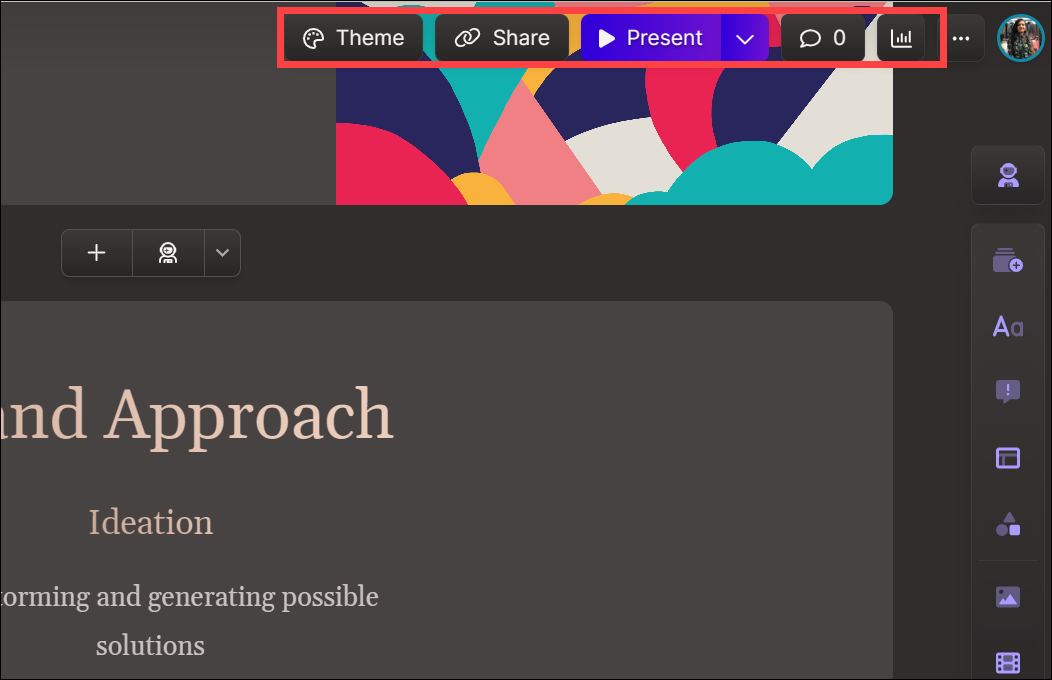 You can also edit the theme by going to the 'Theme' option from the toolbar on the top. The top toolbar also lets you share, present, or view the analytics for the deck from the respective options.