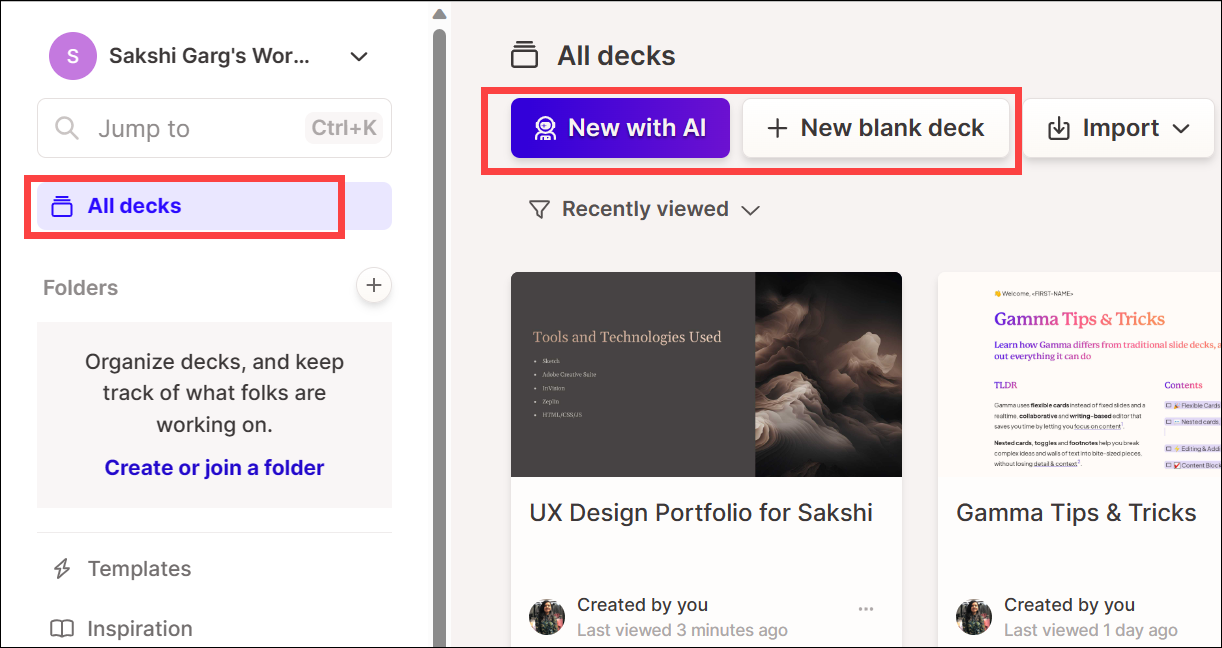You can see all your decks here. You can also create a new deck by using the 'New with AI' option that uses Gamma AI to create the deck or 'New blank deck' option where you can start from scratch using Gamma's tools at your disposal.