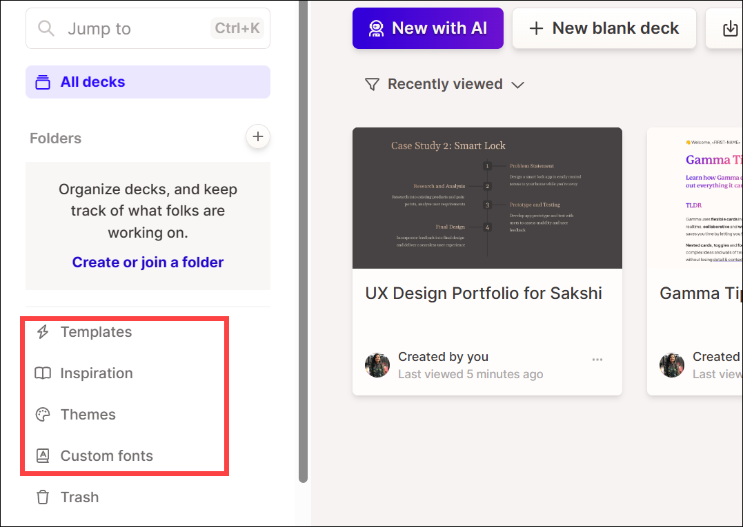 From the navigation menu on the left, you can also browse templates, themes, or some sample decks from Gamma (for inspiration), custom fonts, etc.
