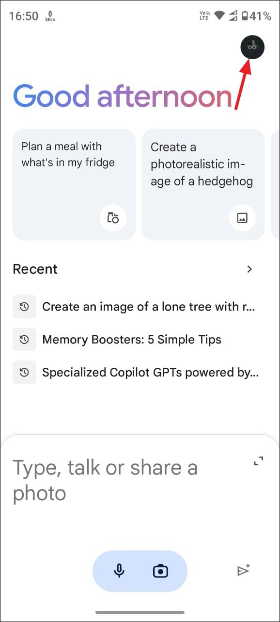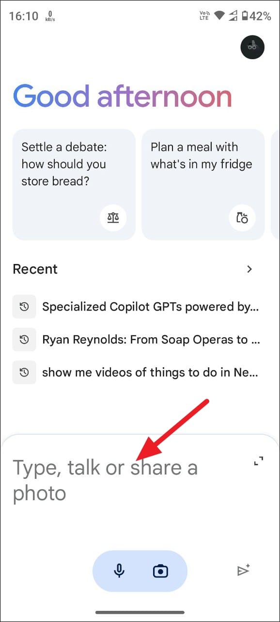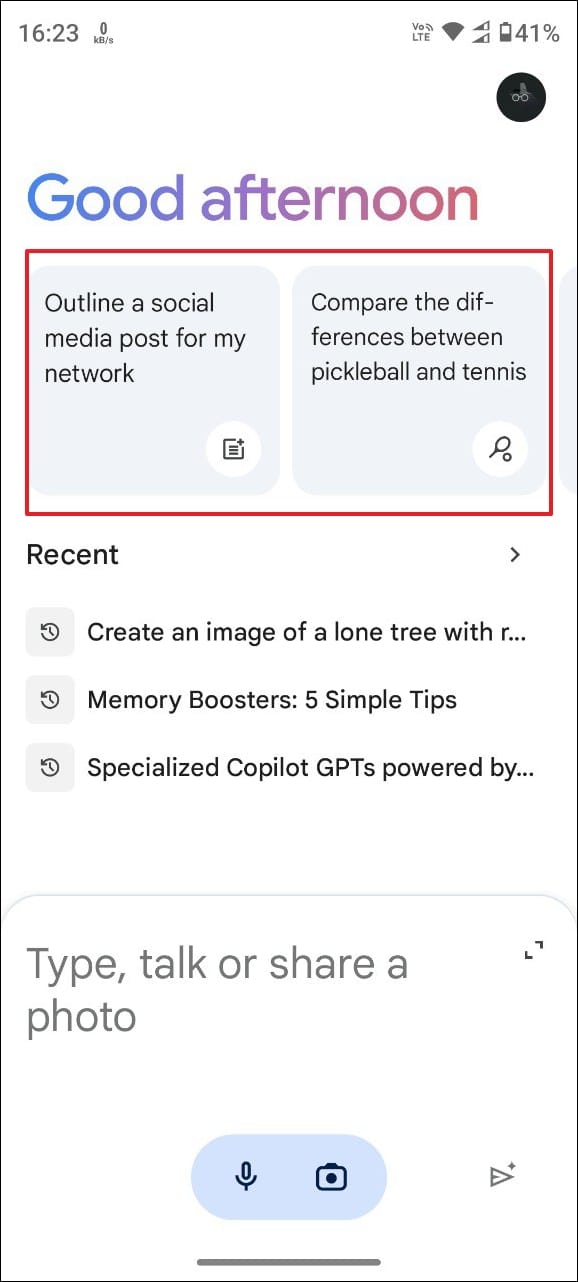 - There will also be a search box at the bottom where you can type in prompts to create content or look up information. You can also use voice commands or take pictures using the camera icon to include them in your prompts.