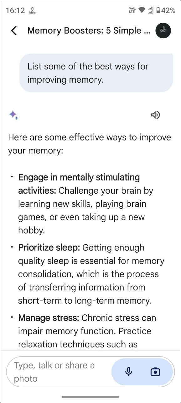 List some of the best ways for improving memoryand tap the small arrow icon to get results. - You can also generate images using the app with a prompt like