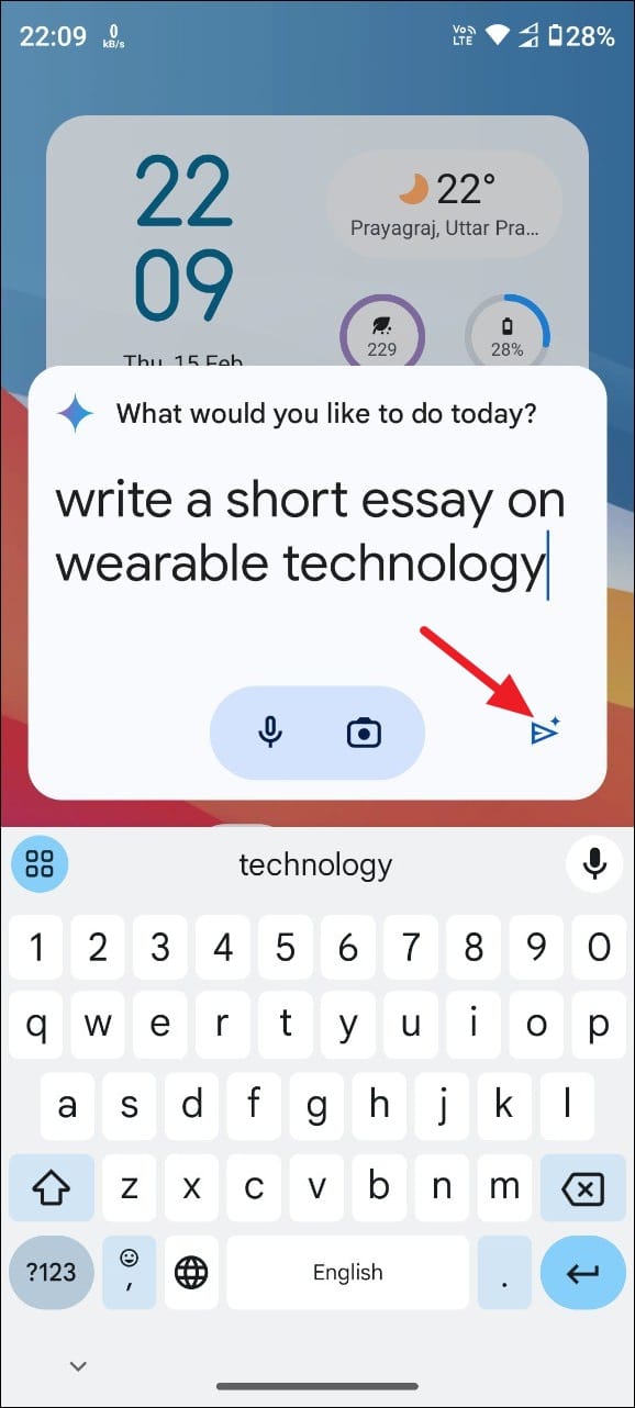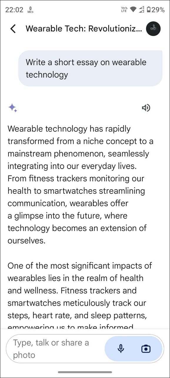 write a short essay on wearable technology, tap the arrow at the bottom right to view the results. You can use Gemini to ask anything on the go, but that's about it right now.