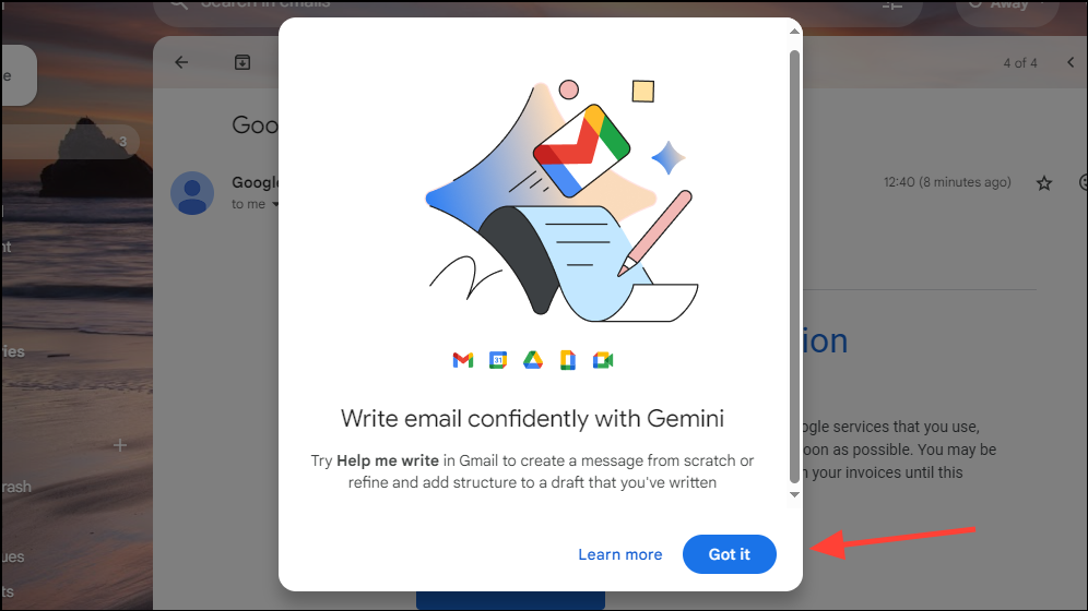- When you log in to Gmail with a paid subscription for the first time, Google will first inform you about its new AI functionalities with Gemini. Click the 'Got It' button to get started.