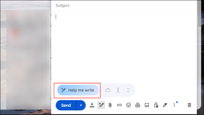 - Click the ‘Help me Write’ (pencil icon) at the bottom of the window to start writing an email with the help of AI.