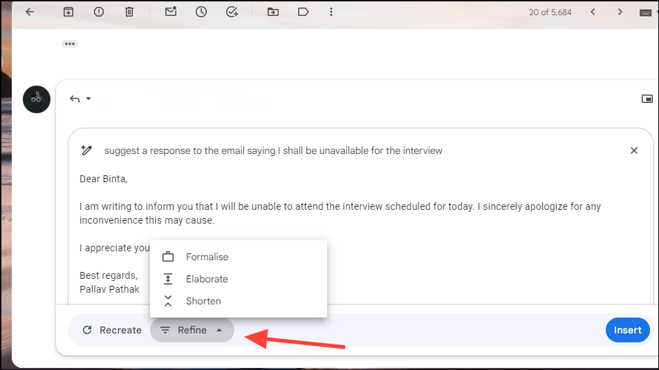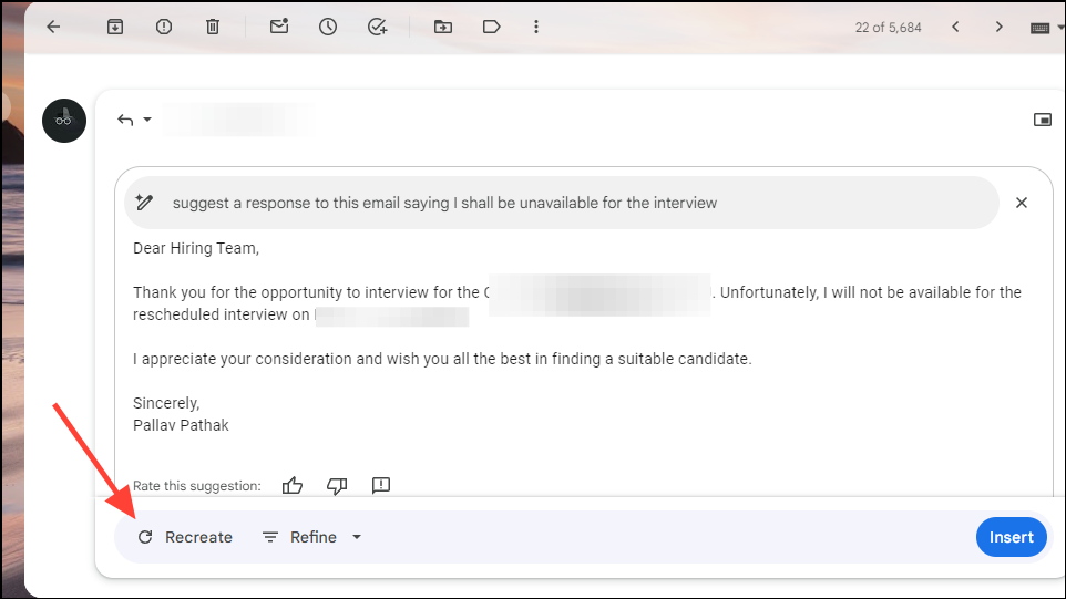- You can also customize the draft using the 'Refine' button next to the 'Recreate' option.