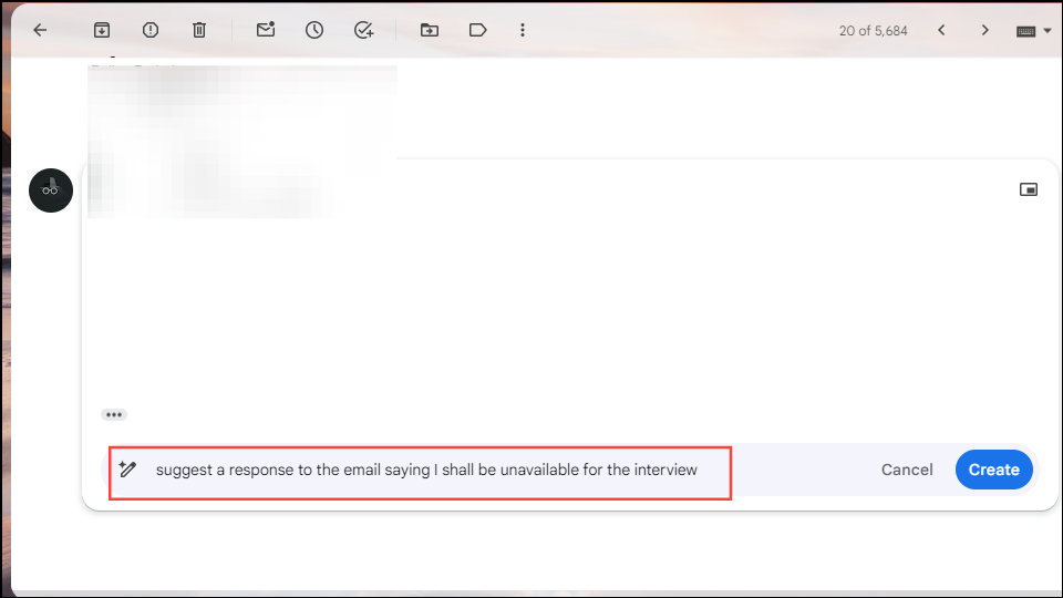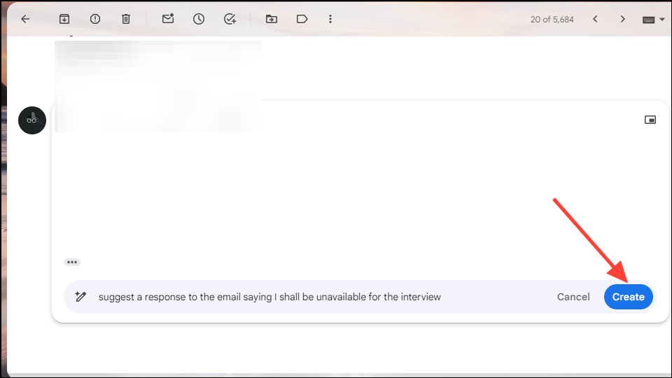 - Click the 'Create' button or press the 'Enter' key to allow Gemini to come up with a response. Gemini will write a draft for you right away.