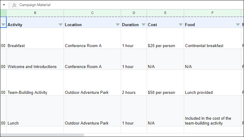 Step 2: Input a prompt like create a table for a full day team event and click 'Create' or press 'Enter'.