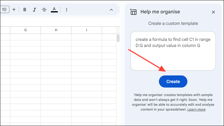 Step 2: Enter a prompt like create a formula to find cell C1 in range D:G and output value in column G, then click 'Create'.