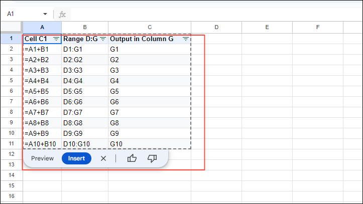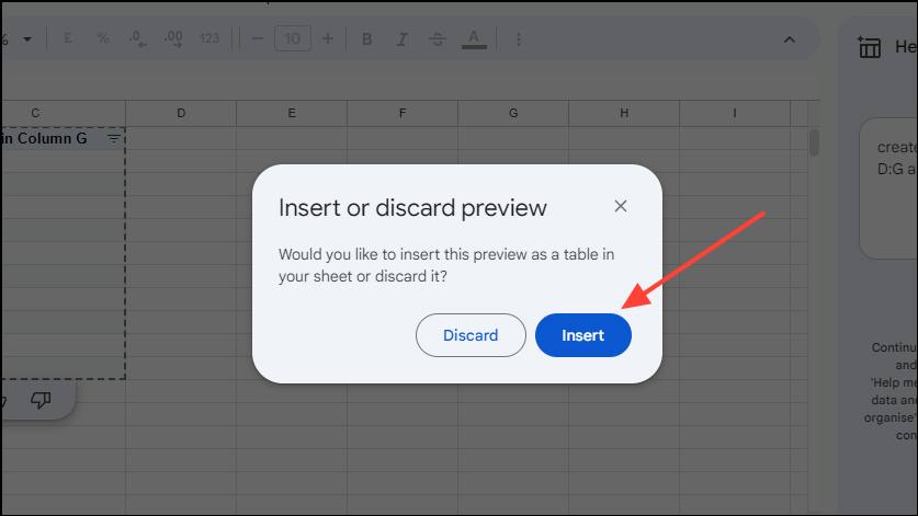 Step 4: When prompted after selecting a cell, click 'Insert' to add the formula to your spreadsheet.