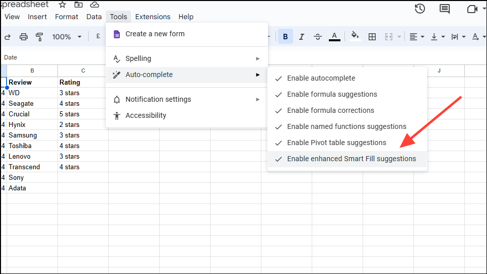 Step 1: In your spreadsheet, click on the 'Tools' menu and select 'Auto-Complete' to access smart fill settings.