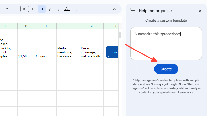 Step 1: In the 'Help Me Organize' panel, type a prompt such as summarize this spreadsheet and press 'Enter'.