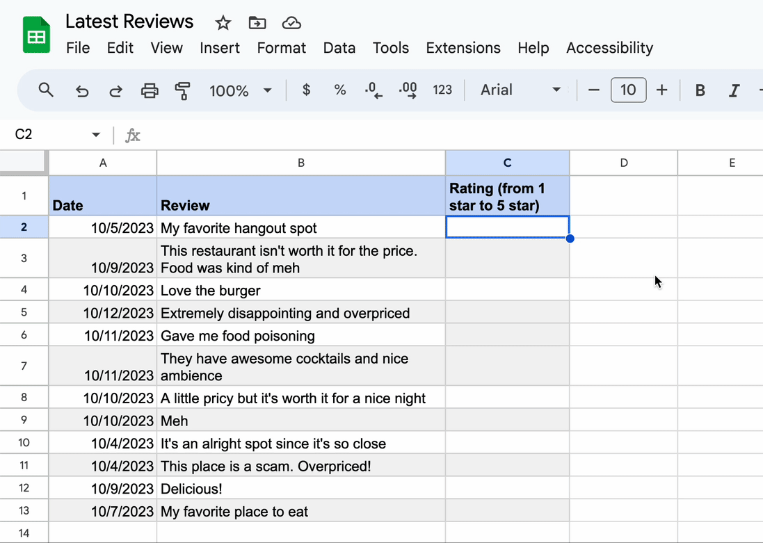 Step 3: Begin entering your data. For example, create a table reviewing various restaurants with a star-rating system.