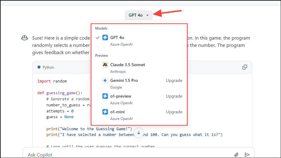 - Free users can only access the GPT-40 model when interacting with GitHub Copilot, but you can see which ones are available for paid subscribers by clicking on the dropdown at the top of the screen.