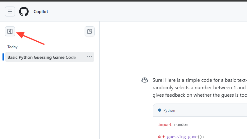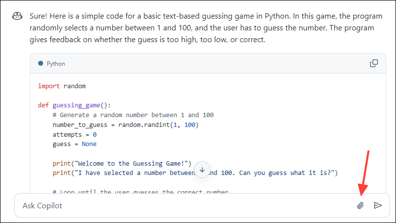 - Copilot will show you a few suggestions you can select to get started. Alternatively, you can enter your own prompt in the text box at the bottom and hit the 'Send' button to get a response. You can ask the AI chatbot to generate code for a Python game to check how it works.
