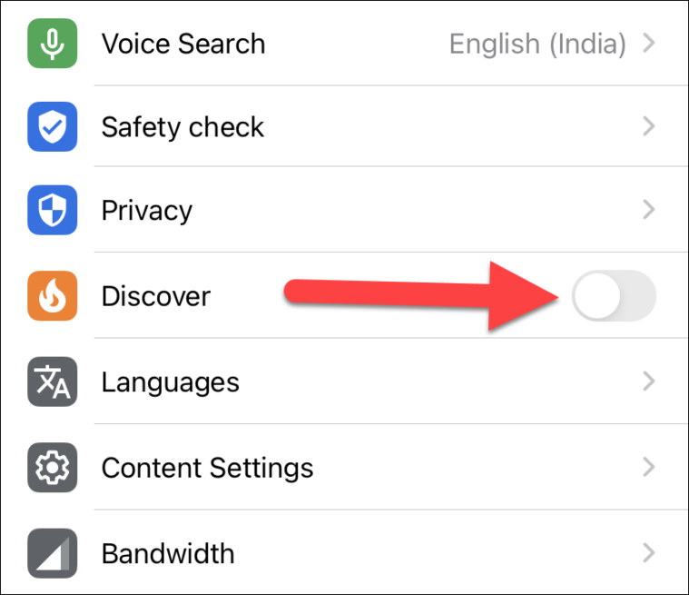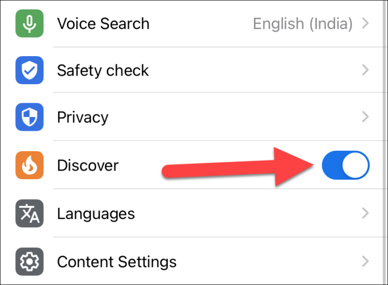 Then, scroll down a bit on the Chrome Settings screen and turn on the toggle switch next to ‘Discover’ label.