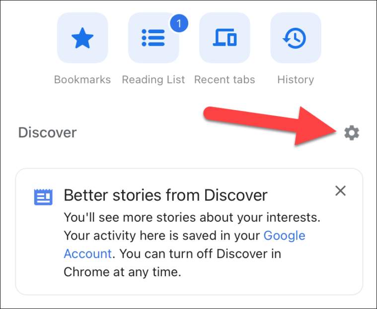 To change Discover settings in Chrome, open a new tab in Chrome and tap on the Settings gear icon next to the ‘Discover’ label.