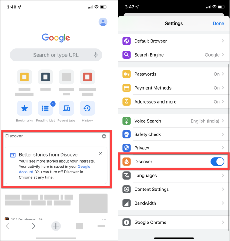 If at any point you find the Discover feed in Chrome distracting, you can similarly disable it from the Chrome settings.