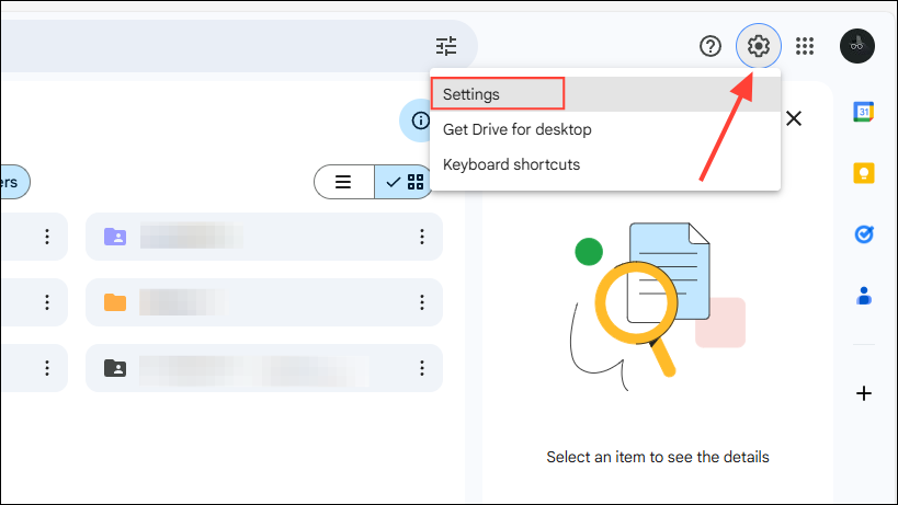- Sign in to Google Drive, click on the gear icon on the top right, and then click on 'Settings'.