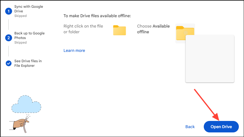 - Once you've signed in, click on 'Skip' and then on the 'Open Drive' button.