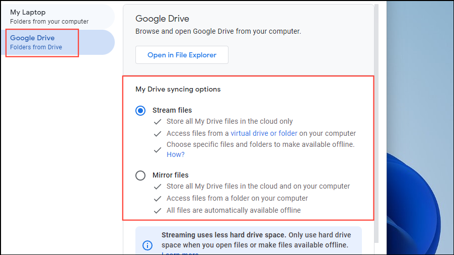 - Click on 'Google Drive' on the left and then you can choose whether to stream or mirror your files by clicking on the respective option. Streaming files lets you choose which files you can access offline while mirroring them stores a copy of all files on your PC.