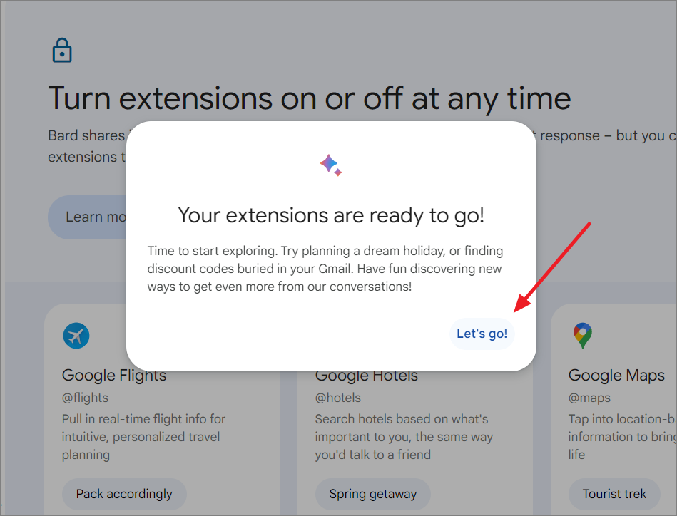 - Finally, click 'Let's go!' to start using Gemini Extensions.