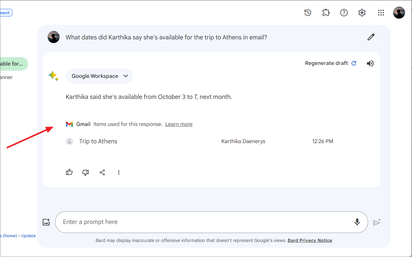 What dates did Karthika say she's available for the trip to Athens in email?Gemini will use extensions to gather information from your Gmail and provide your answers.
