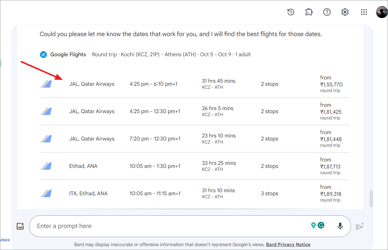 Show me flights from Kochi to Athens next month around the dates that works for KarthikaAnd let Gemini fetch flight information for you.