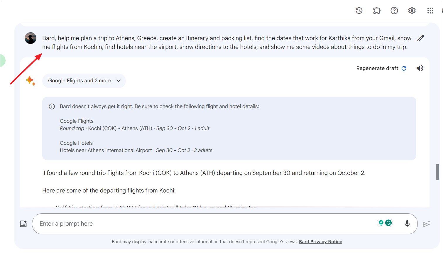 Gemini will provide a sample trip plan and itinerary for you, which you can modify with additional prompts.