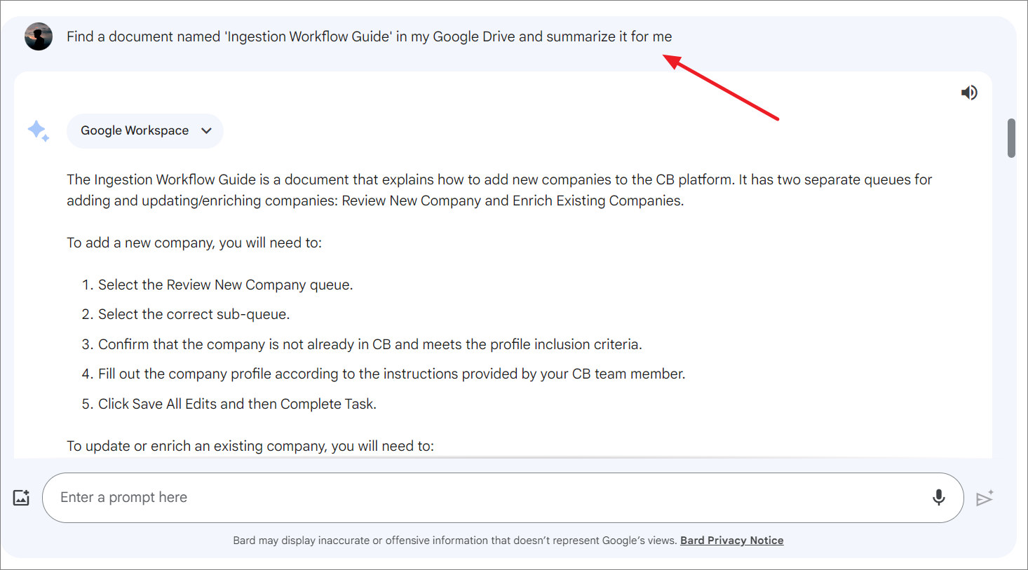 For example, let's ask Gemini to find and summarize a large document in your Google Drive with this prompt: