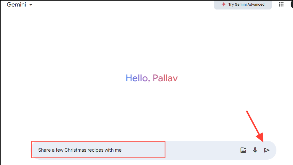 - For instance, you want Gemini to share a few recipes with you for Christmas but you don't eat meat. First, type in your prompt or request and hit the send button.