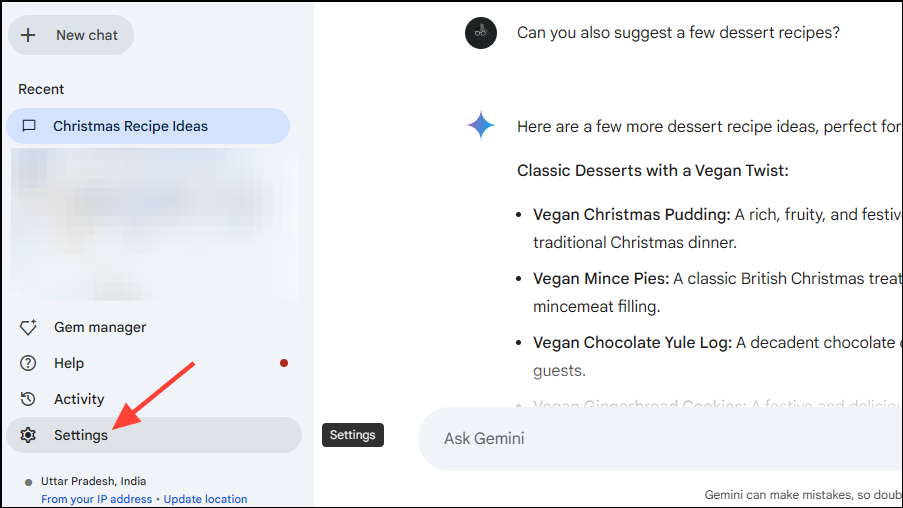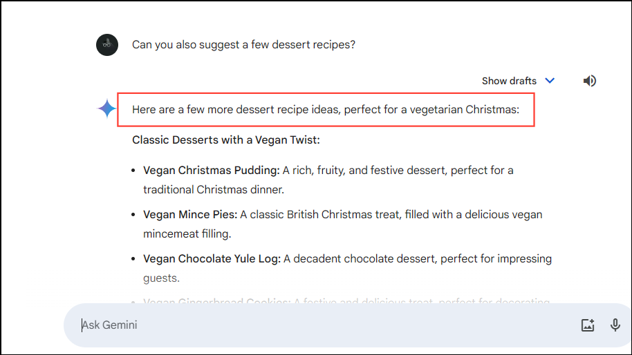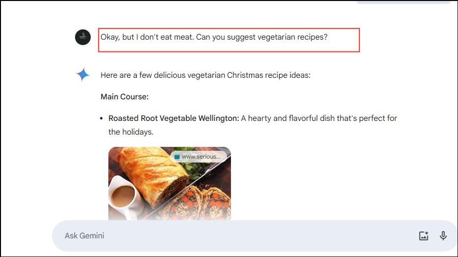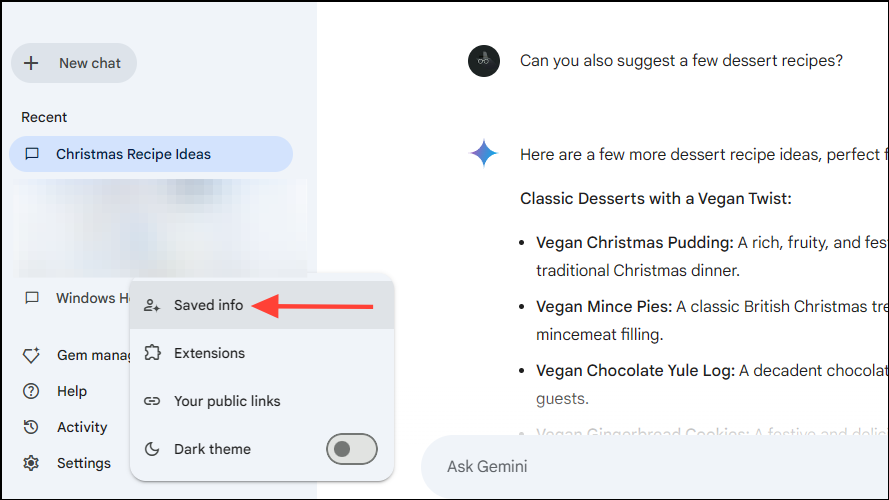- Now, when you ask Gemini a question on a related topic, it will remember the information you provided previously and tailor its responses by considering that information. For instance, you can ask it for a few dessert recipes. Now, it will automatically suggest vegetarian recipes without you having to remind it.