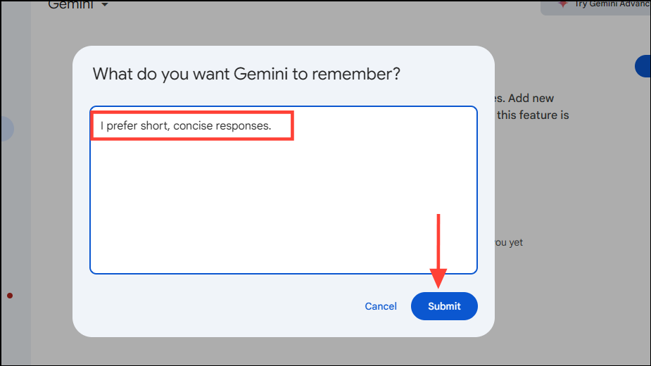 - Now, simply type what you want Gemini to remember in the box that appears and click on the 'Submit' button. For instance, you can tell the AI chatbot that you prefer short responses and all future responses from Gemini will adhere to that.