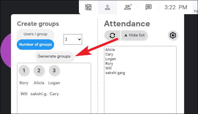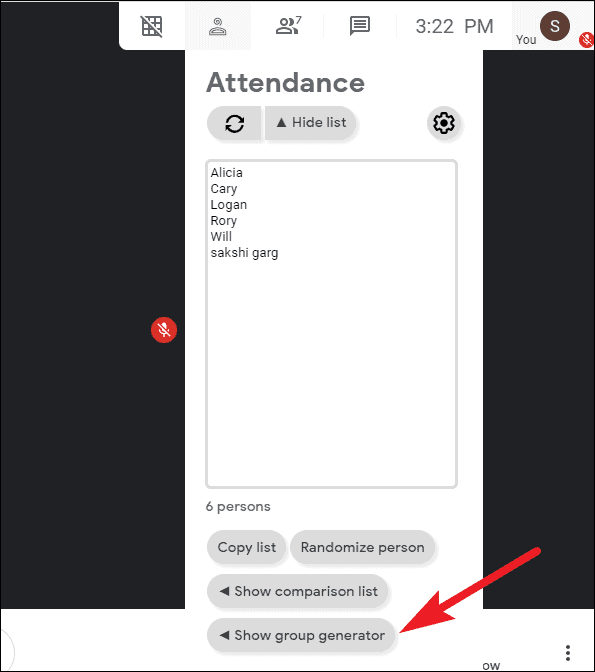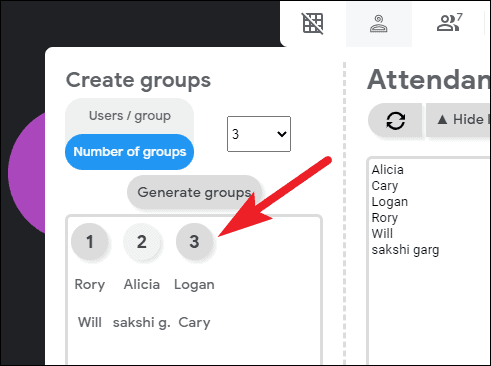 Once the attendance list is displayed, click on the ‘Show group generator’ tab at the bottom of the menu.