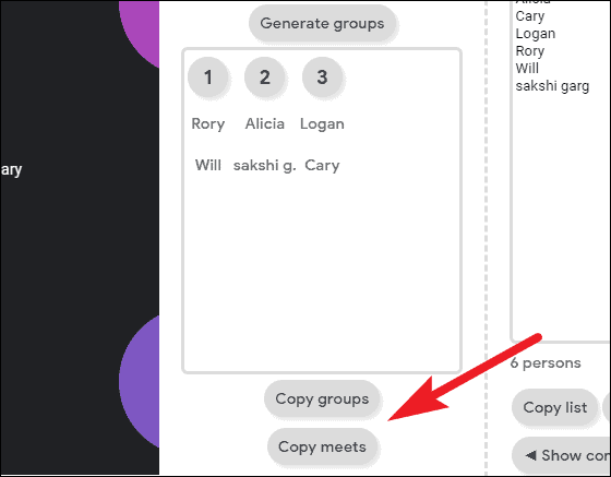 It will generate the groups, and attendees will be allotted to them randomly. Click on ‘Copy groups’ and ‘Copy meet’ one by one, and send the copied information in the meeting chat. That is, first send the group information and then the meeting links in the chat.