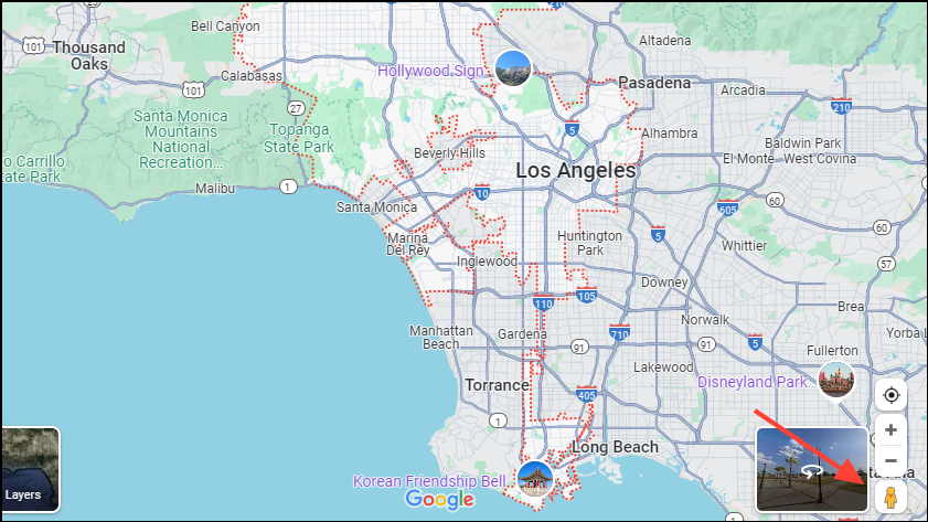- Next, click on the 'Pegman' icon on the bottom right of your screen and drag it to any location on the map to open Street View.