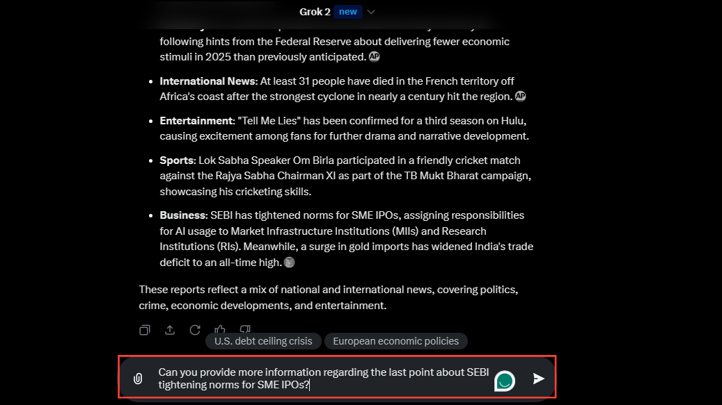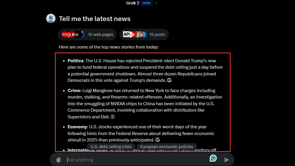 - Grok AI will show you the latest news in the form of bullet points along with a prompt box at the bottom. You can use this to provide the AI with another prompt or request.