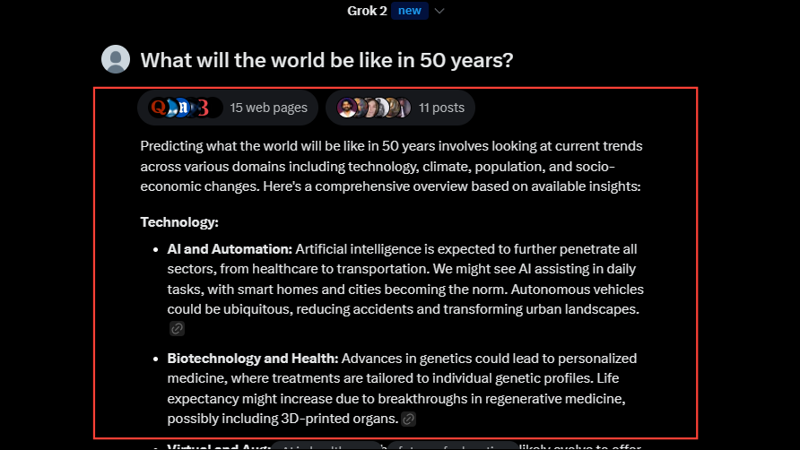 - Grok AI will complete your request such as providing more information and will even show you links to posts and web pages related to the topic at the top.