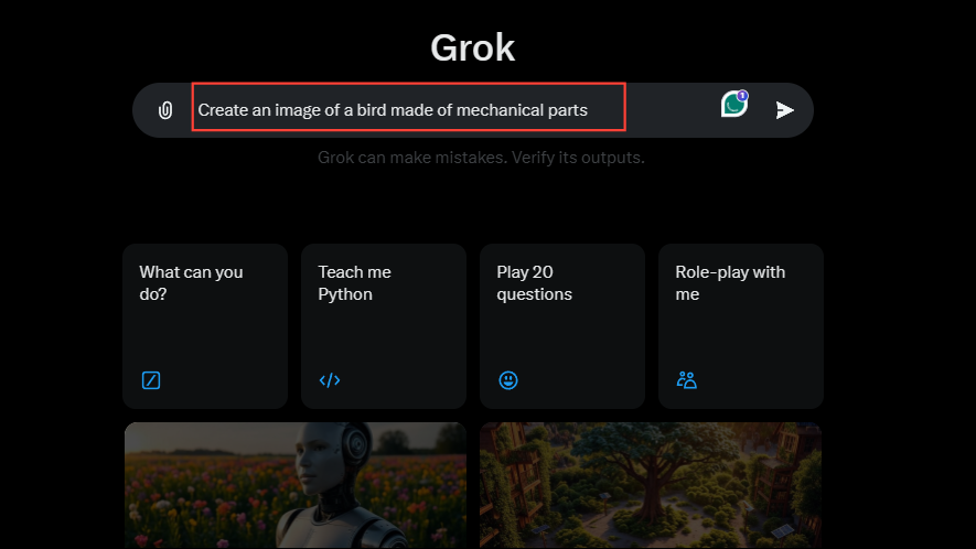 - To generate an image, type in a description of the image you want Grok AI to generate and hit Enter. Make sure to use the words 'Create' or 'Generate' in your prompt.