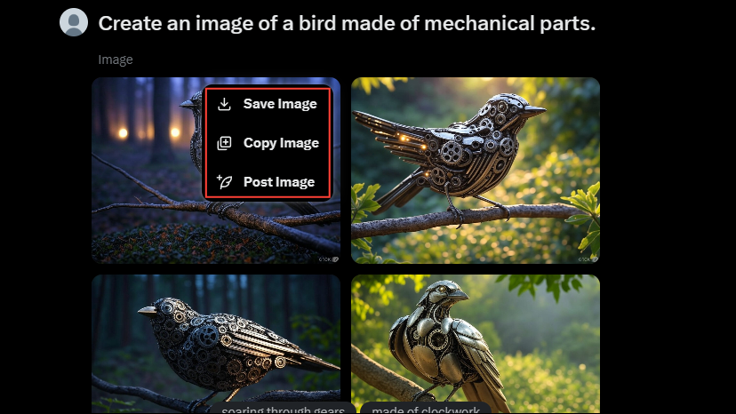 - You can hover your cursor over any of the generated images and three dots will appear on the top right of the image. Click on it and you can save the image, copy it, or post it to X.