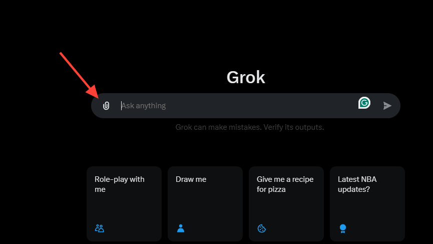 - To analyze an image, go back to the main page and start a new chat as explained previously. First, you need to upload the image you want Grok AI to analyze. To upload an image, click on the paperclip icon below the prompt box and then select your image from your device.