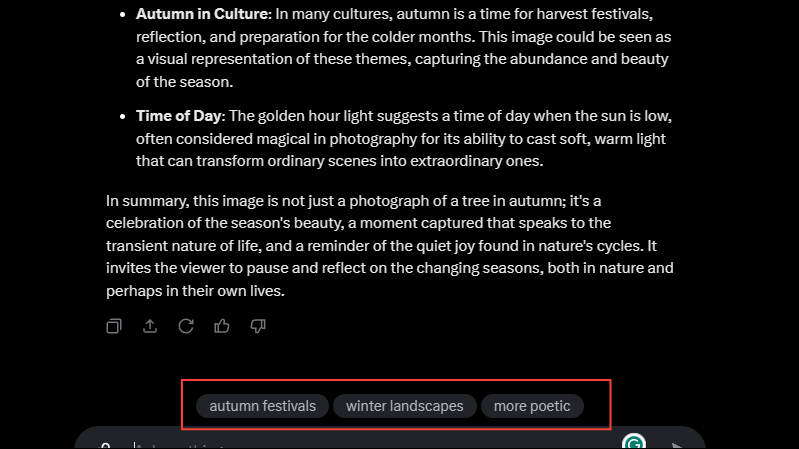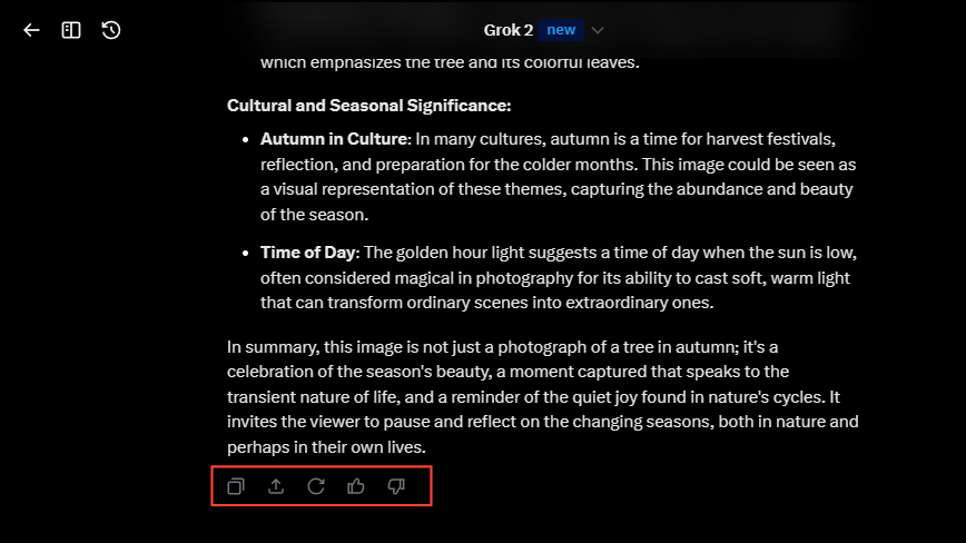 - Scroll down and you can copy, share, or regenerate the response using the buttons at the bottom of Grok AI's response. You can also help improve the response by clicking on the thumbs-up or thumbs-down buttons.