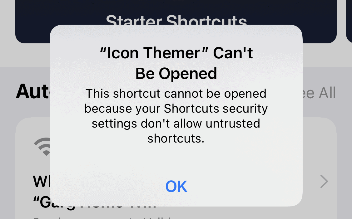 It will redirect you to the Shortcuts app. Now, if you’ve never used external shortcuts before, a message will appear on your screen that the shortcut cannot be opened as your shortcut security settings don’t allow untrusted shortcuts.