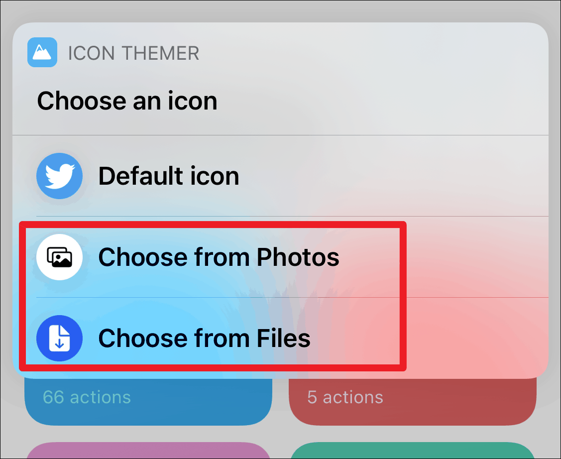 Now, the option to choose an icon will appear. You can use the default icon (which obviously you don’t want), or you can choose a photo from iPhone photos or Files. Tap on the option where the photo you want to use as the icon is stored. For the sake of this guide, let’s select ‘Choose from Photos’.